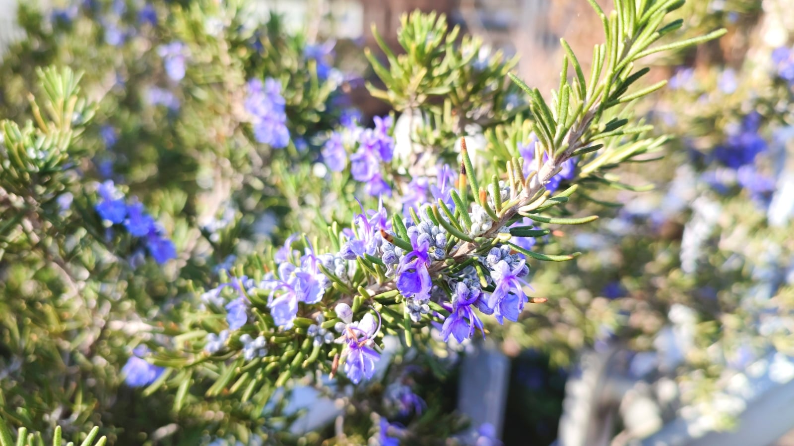 Rosemary has short, narrow, stiff leaves with a strong herbal scent. Its flowers bloom in late spring and early summer and appeal to an assortment of pollinators. The flowers are small, hooded, and pale lavender, forming at the end of upright leafy branches. Mature rosemary shrubs become densely bushy with thickened woody stems. These attractive plants look great in your herb garden or as a shrubby accent plant.