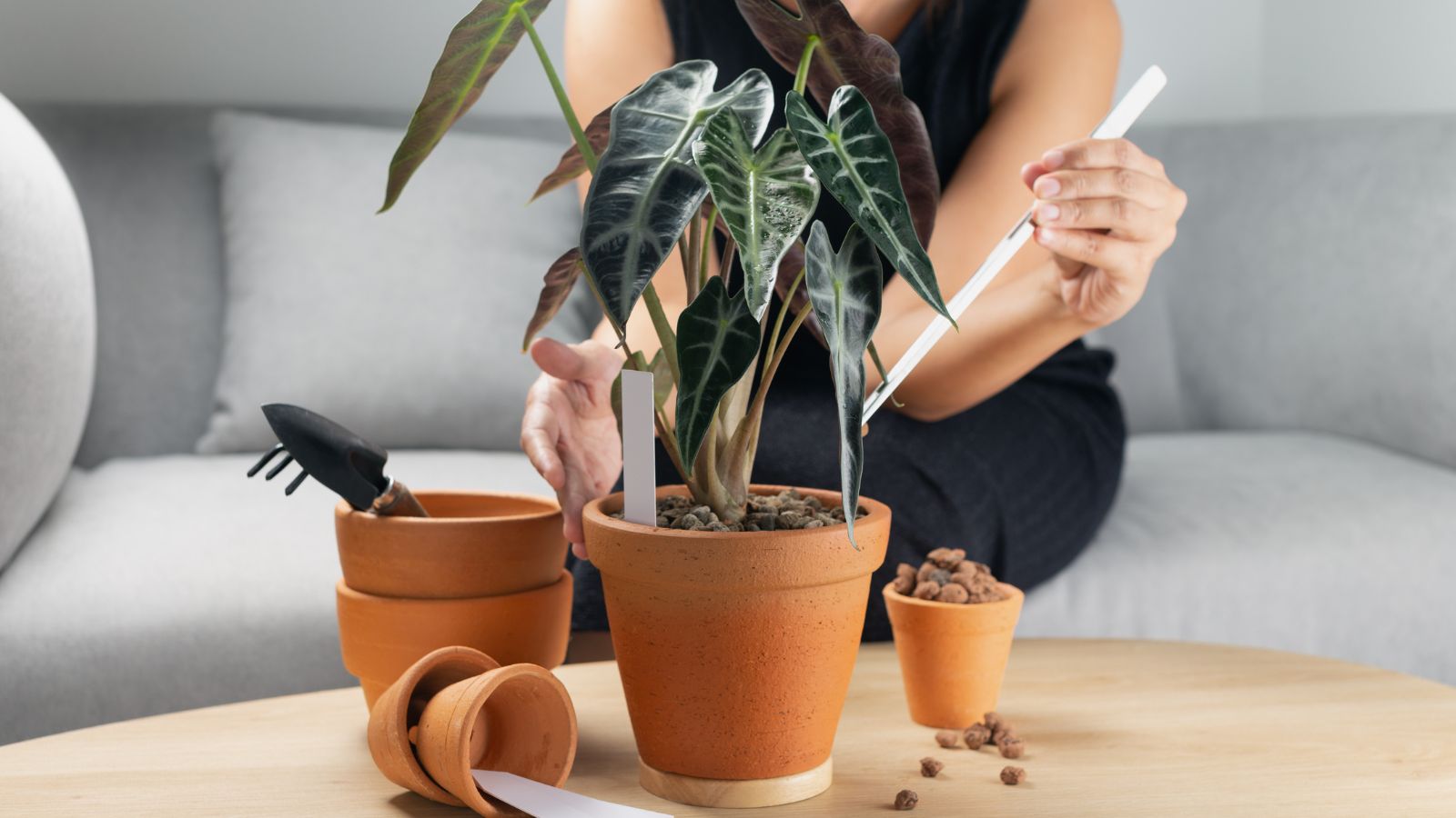 Avoid pulling from the stems as the leaves may easily snap off. Instead, squeeze the sides of the pot to loosen the soil, turn the pot on its side and gently pull the plant out. If your Alocasia is planted in a terra cotta or ceramic pot and gets stuck, you can also run a knife along the edges of the pot.