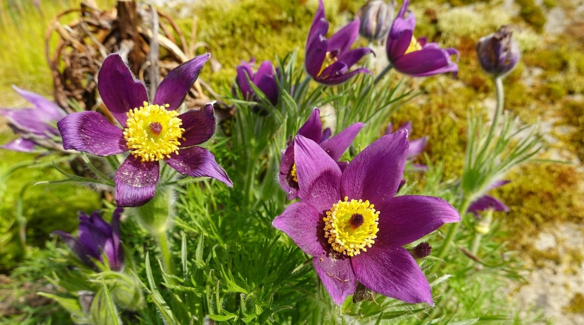 The name ‘pasque’ derives from the word Pasch, a term meaning Easter and Passover. The bloom of Pulsatilla flowers roughly coincides with those spring holidays, so the name is quite apropos. There are more than forty species of pulsatilla, some of which have purple flowers. All Pulsatilla have fairly large, solitary, cup-shaped flowers with bright yellow centers.